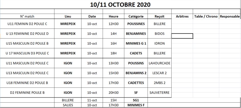 Même jour mais pas mêmes heures, ni même endroit, ça va jouer à Igon. Samedi 13h30, nos poussins ouvrent la voie en recevant Lahourcade. A 15h30, ce sont nos benjamins 2 qui vont au mastic contre Lescar 2. A 17h30, au tour de nos cadettes de se frotter au 2MBS. Enfin, à 20h30, baisser de rideau avec nos seniors filles opposées à Sauveterre.