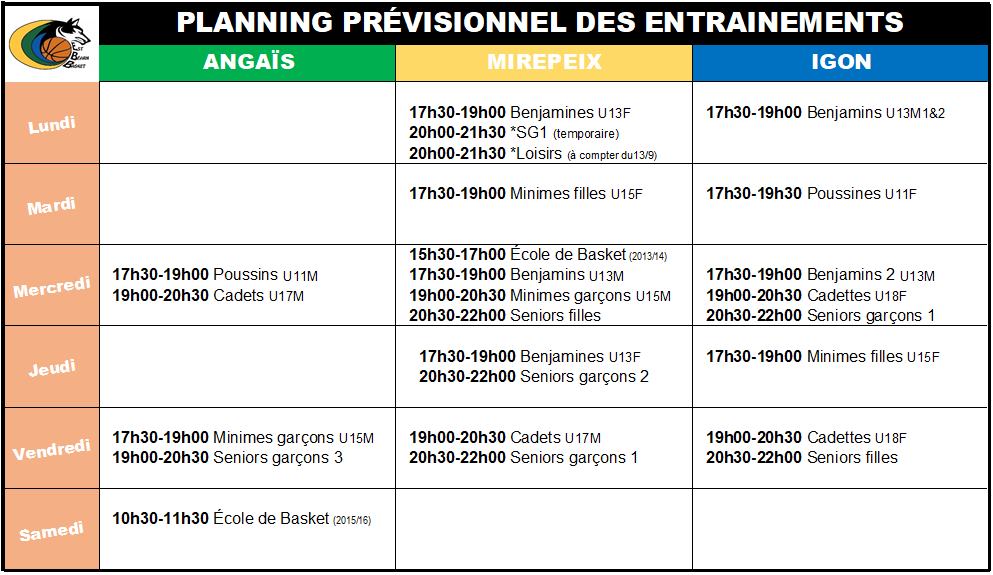 Cadettes (2004-2005-2006) : mercredi 1er septembre, 19h00 à Igon