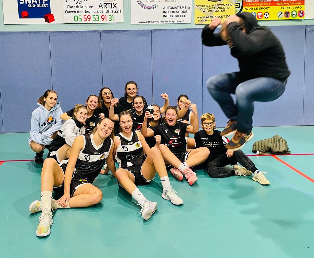Victoire des sf1 sur le terrain d’Artix. Les filles ont joué un basket très sérieux dans une salle blindée d’artisiens. Le match a été serré tout le long sans qu’aucune équipe se fasse le break. Une dernière remise en jeu mal maîtrisée par Artix et très bien défendue par nos louves nous libère. Je suis très content de l’unité et de la combativité des dix joueuses. Mention spéciale à Maëva pour tous les 3 pts placés, très bien servie par ses coéquipières…